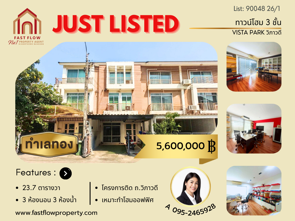 ขายทาวน์โฮม 3 ชั้น หมู่บ้านวิสต้า ปาร์ค วิภาวดี (Vista Park Viphavadi) ทาวน์เฮ้าส์ โฮมออฟฟิศ ติดถนนวิภาวดีรังสิตฝั่งขาเข้า ใกล้รถไฟฟ้าสายสีชมพู เชื่อมต่อรถไฟสายสีแดง สถานีหลักสี่ ARA
