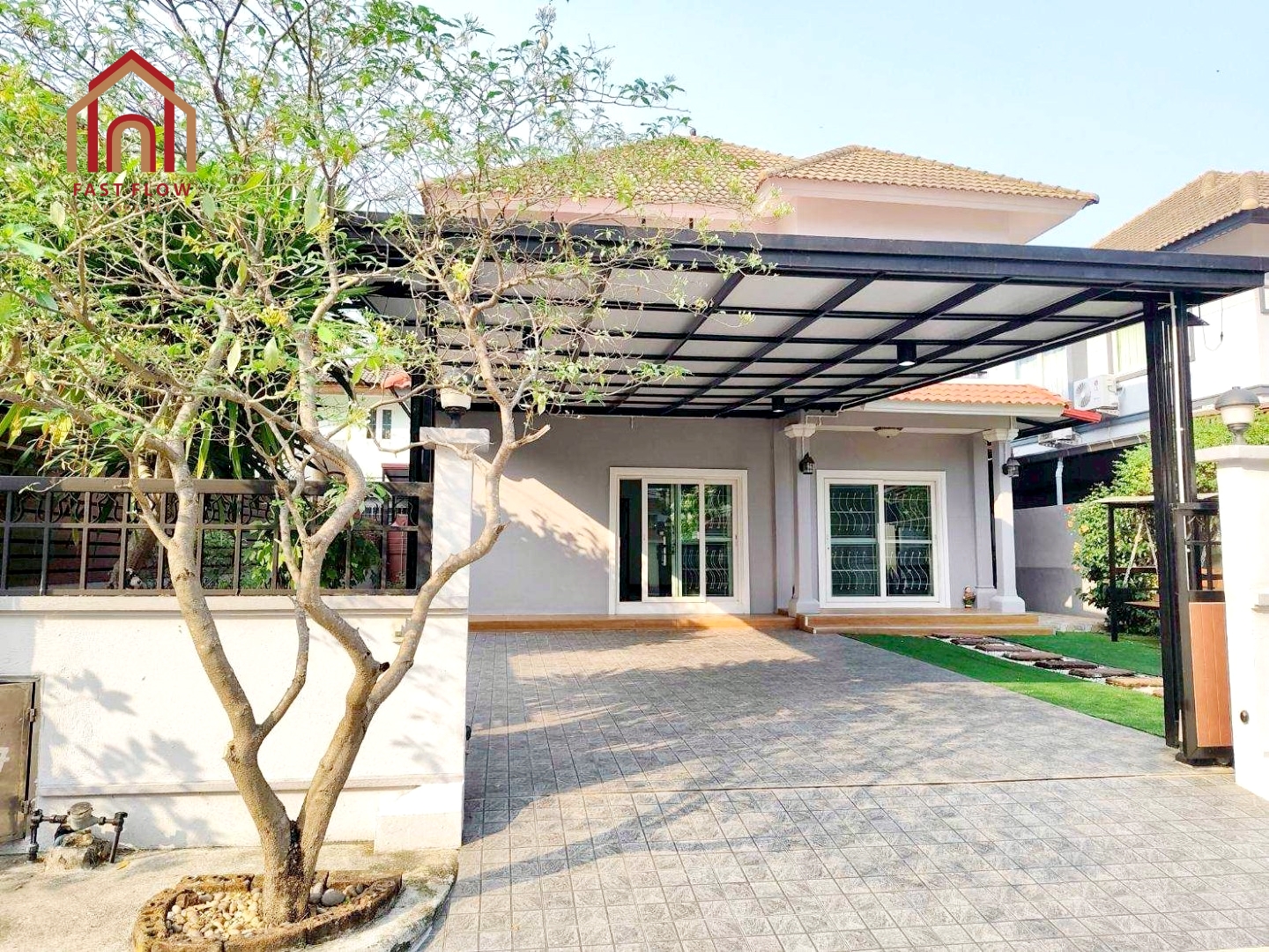– ต่อเติมโรงรถ พื้นปูกระเบื้อง จอดรถในร่มได้ 2 คัน