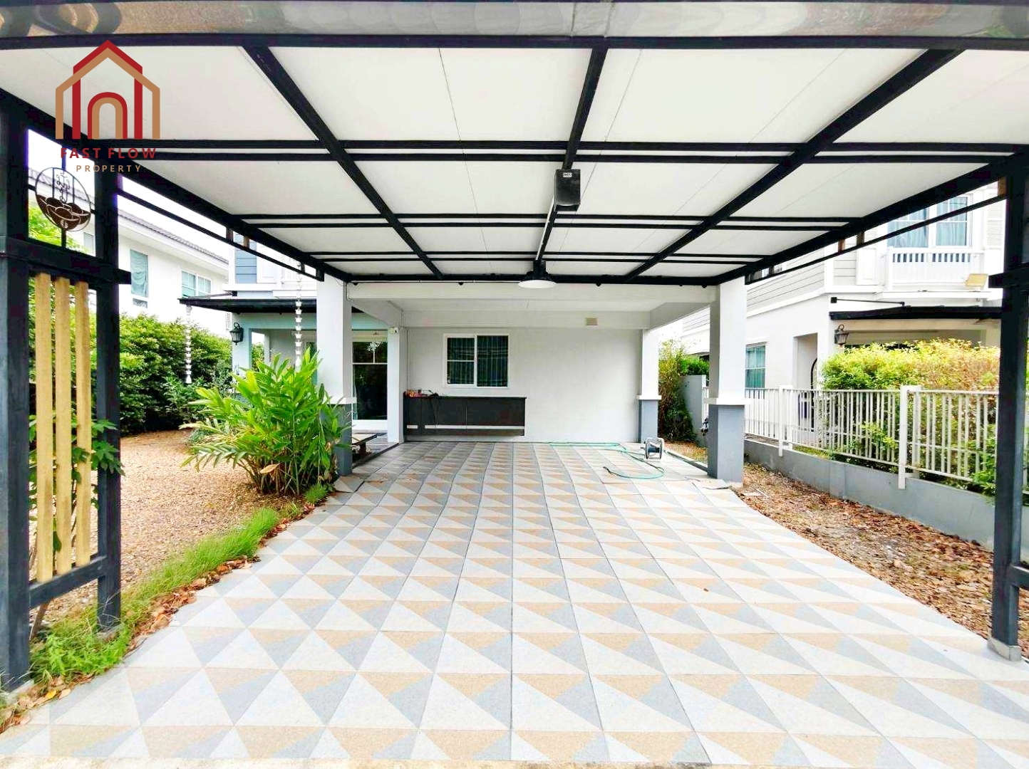 – ต่อเติมโรงรถพร้อมปูกระเบื้อง จอดรถในร่มได้ 4 คัน