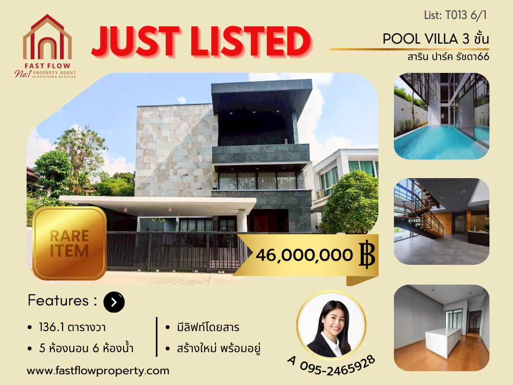 ขายบ้านเดี่ยว Pool Villa 3 ชั้น โครงการสาริน ปาร์ค รัชดา 66 สไตล์โมเดิร์น พร้อมลิฟท์ Sarin Park – Ratchada66 ประชานุกูล3 ซอย3 ใกล้ รพ.เกษมราษฎร์ ประชาชื่น ARA