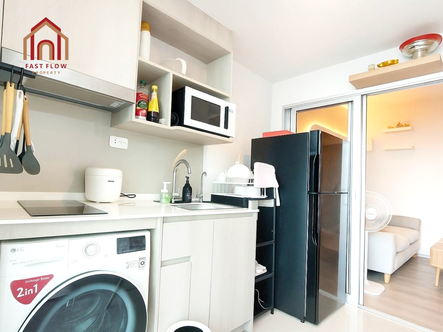 – พื้นที่ครัวแยกเป็นสัดส่วน พร้อมเตาไฟฟ้าและเครื่องดูดควัน