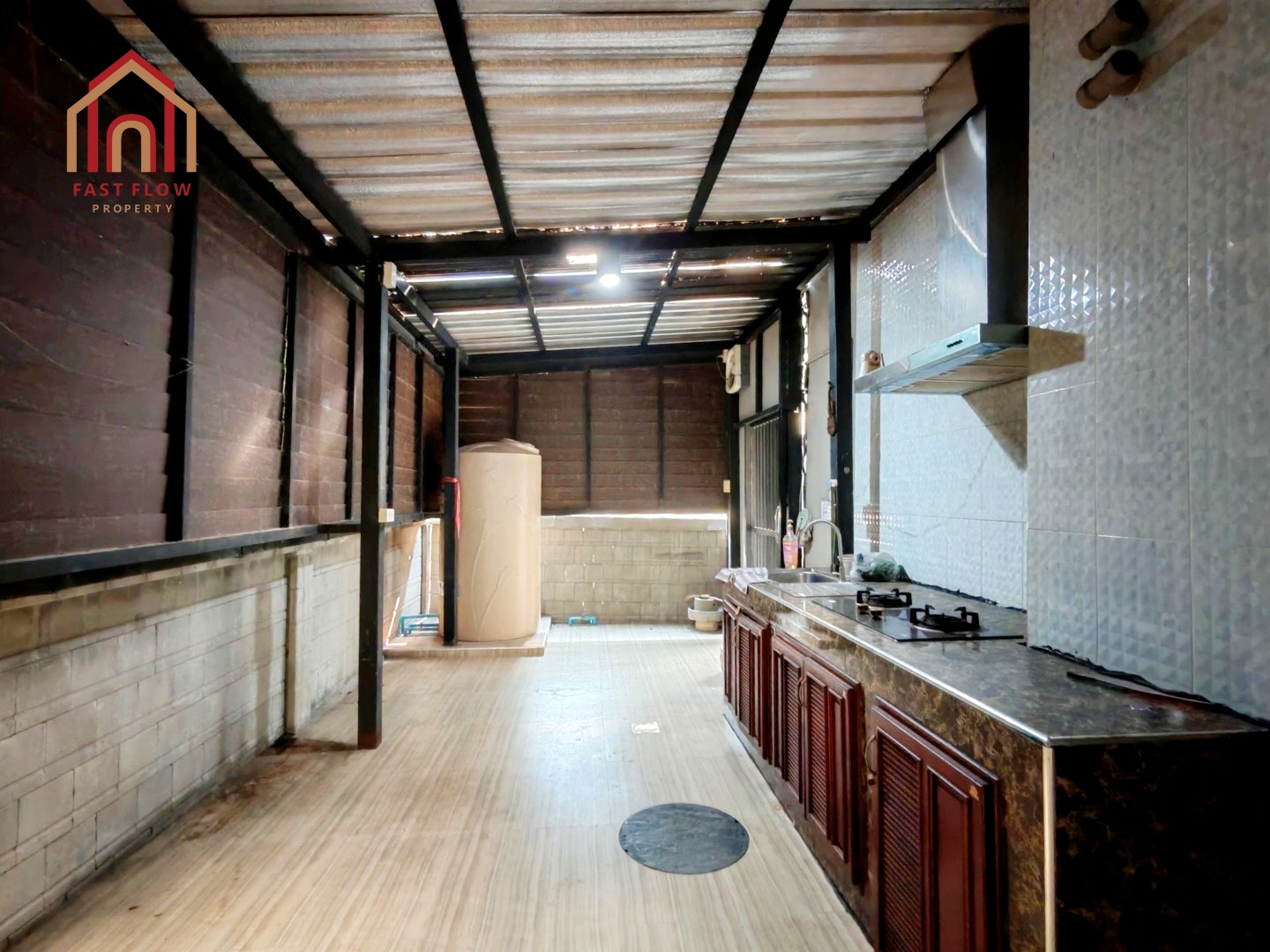 – ต่อเติมครัวไทยด้านหลังบ้าน เต็มพื้นที่ เคาน์เตอร์ครัวปูนอย่างดี พร้อมติดเครื่องดูดควัน