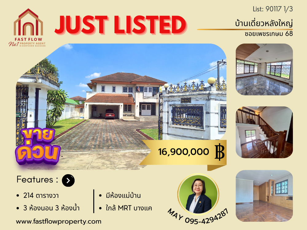 ขาย บ้านเดี่ยว 2 ชั้น ใกล้โลตัสบางแค ซอยเพชรเกษม68 แยก34 ซอยแสงเพชร หลังมุม บ้านหลังใหญ่ 214 ตารางวา บ้านสร้างเอง ไม่มีค่าส่วนกลาง ใกล้ MRT บางแค พุทธมณฑลสาย 1 ซอย 9 URA