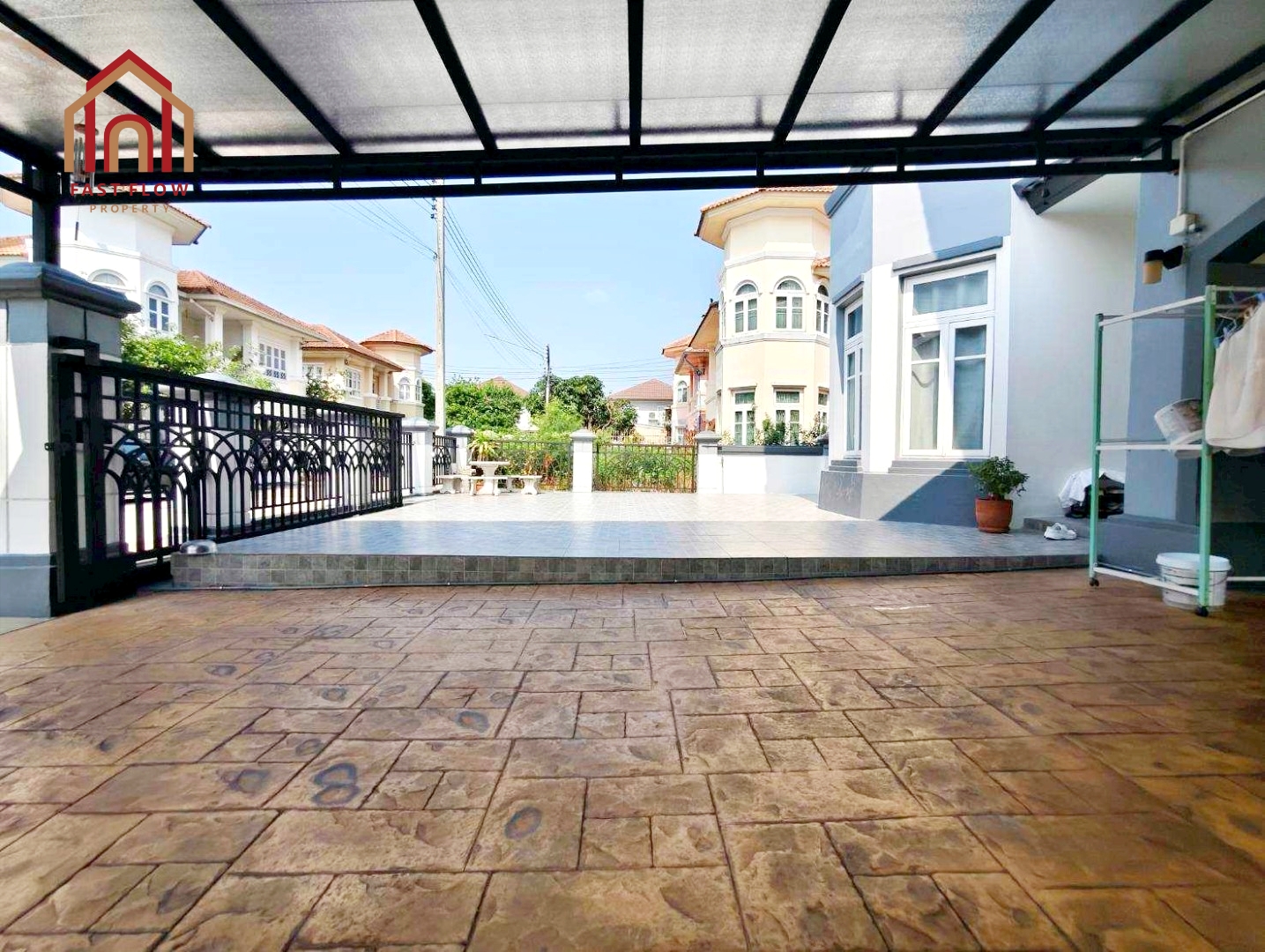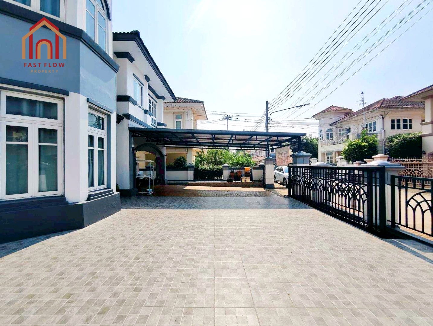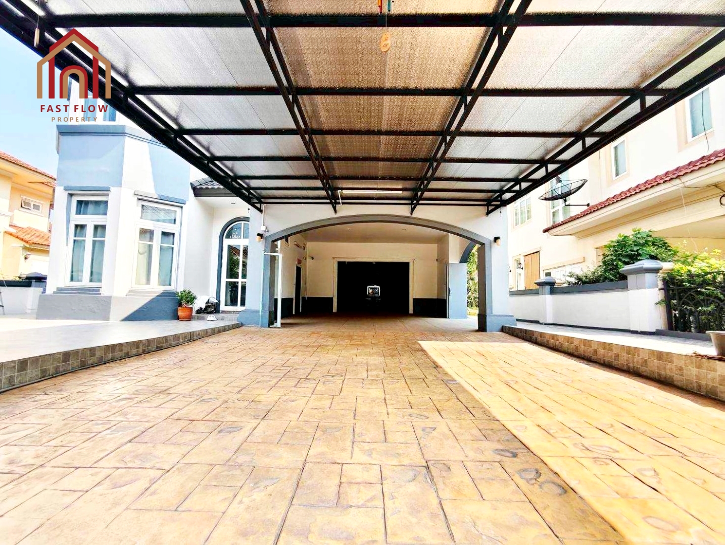 – ต่อเติมโรงรถ พร้อมปูกระเบื้อง จอดรถในร่มได้ 4 คัน หน้าบ้านได้อีก 4 คัน